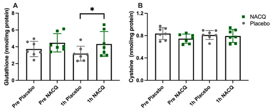 - Medved, I.; Brown, M.J.; Bjorksten, A.R.; Murphy, K.T.; Petersen, A.C.; Sostaric, S.; Gong, X.; McKenna, M.J. N-acetylcysteine enhances muscle cysteine and glutathione availability and attenuates fatigue during prolonged exercise in endurance-trained individuals. J. Appl. Physiol. 2004, 97, 1477–1485. [Google Scholar] [CrossRef]