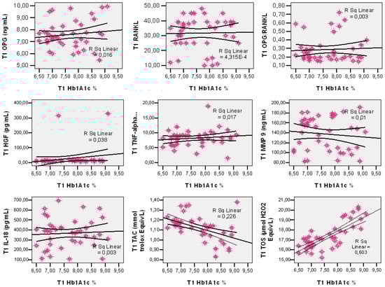 In the DM group, three months after dental extraction, the individual values of HbA1c recorded the following correlations with salivary markers: an indirect correlation, moderate in intensity, was observed with TAC (r = −0.475; R = 0.226; p = 0.002) and a direct correlation, moderate in intensity, with TOS (r = +0.777; R = 0.603; p = 0.001) (Figure 1). There was a direct correlation, reduced in intensity, with OPG, HGF and TNF-α (r = +0.128; R = 0.016; p = 0.424; r = +0.194; R = 0.038; p = 0.224 and r = +0.131; R = 0.017; p = 0.415). On the other hand, HbA1c and RANKL, OPG/RANKL, MMP-9 and IL-18 are apparently independent parameters (r = +0.052; R = 0.0004; p = 0.746; r = +0.021; R = 0.003; p = 0.897; r = −0.098; R = 0.01; p = 0.540; and r = +0.057; R = 0.003; p = 0.725) (Figure 1).