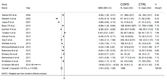 Sub-group analysis showed that the pooled SMD value for the studies measuring GPx in serum (SMD = −1.59, 95% CI −3.41 to −0.22, p = 0.084; I2 = 98.0%, p < 0.001) was non-significantly lower (t = 0.91, p = 0.39) than that observed in the studies assessing plasma (SMD = 0.12, 95% CI −1.00 to 1.25, p = 0.83; I2 = 98.6, p < 0.001). In addition, the pooled SMD value for the studies using the GOLD guidelines (SMD = −0.20, 95% CI −1.67 to 1.27, p = 0.79; I2 = 99.0%, p < 0.001) was similar (t = 0.12, p = 0.91) to that of the studies using the ATS guidelines (SMD = −0.43, 95% CI −0.89 to 0.04, p = 0.07, I2 = 83.4, p = 0.014).