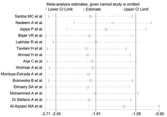 The forest plot for the blood GPx concentrations in COPD patients and non-COPD subjects is reported in Figure 2. In 14 studies [25,26,27,28,29,31,32,33,34,35,36,37,38,39], COPD patients had lower blood GPx concentrations when compared to non-COPD subjects (mean difference range, −0.42 to −19.93), however, the difference was statistically significant in only two studies [34,36]. Extreme heterogeneity between studies was observed (I2 = 97.0%, p < 0.001). Thus, random-effects models were used. Overall, the pooled results showed that blood GPx concentrations were significantly lower in COPD patients (SMD= −1.91, 95% CI −2.55 to −1.28; p < 0.001). Sensitivity analysis showed that the corresponding pooled SMD values were not altered when any single study was sequentially omitted (effect size range, between −2.04 and −1.46, Figure 3). However, funnel plot analysis showed that the study by Al-Azzawy et al. [39] influenced graph symmetry which had a possible effect on the magnitude of the results (Figure 4). After removing this study, the SMD was attenuated but remained significant (SMD = −1.46, 95% CI −2.02 to −0.90, p < 0.001) with persistent, extreme heterogeneity (I2 = 96.2%, p < 0.001).