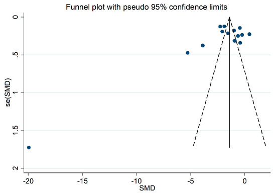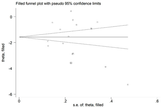 There was no publication bias, after removing the study by Al-Azzawy et al. [39] (Begg’s test, p = 0.74; Egger’s test, p = 0.94). The “trim-and-fill” method identified two potential missing studies to be added to the left side of the funnel plot to ensure symmetry (Figure 5). The adjusted SMD was further increased as a result (SMD = −1.69, 95% CI −2.26 to −1.12, p < 0.001).