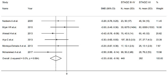 In univariate meta-regression, no significant associations were observed between the effect size and age (t = −1.89, p = 0.10), gender (t = 0.78, p = 0.46), FEV1 (t = 0.62, p = 0.55), FEV1/FVC (t = −0.50, p = 0.63), or specific guideline used (t = −0.20, p = 0.85). In the sub-group analysis, the pooled SMD value in studies which measured GPx in whole blood (SMD = −0.43, 95% CI −0.80 to −0.06, p = 0.023; I2 = 18.4%, p = 0.268) was non-significantly higher (t = 1.07, p = 0.31) than that observed in studies which assessed GPx in erythrocytes (SMD= −1.64, 95% CI −2.25 to −1.03, p < 0.001; I2 = 96.4%, p < 0.001). The search for more homogeneous study sub-groups, according to diagnostic guidelines, matrix type and continent, led to the identification of four studies conducted in Europe which used the GOLD guidelines and assessed erythrocytes [25,28,33,35]. The effect size was still significant (SMD= −1.12, 95% CI −1.43 to −0.81, p < 0.001) with a substantially lower heterogeneity (I2 = 41.4%, p = 0.16). In order to evaluate the relationship between the effect size and disease severity we performed a further meta-analysis in a sub-group of six studies which reported the erythrocyte GPx concentrations in groups with different disease severities (GOLD stage I-II vs III-IV) [26,28,31,32,34,37]. The forest plot for the GPx concentrations in mild/moderate vs severe/very severe COPD patients is reported in Figure 6. In all studies, the GPx concentrations were lower in patients with severe disease (mean difference range −0.56 to −0.06), with a significant difference in two studies [31,37]. The pooled results showed that GPx concentrations were significantly lower in patients with more severe disease (SMD = −0.33; 95% CI −0.50 to −0.16, p < 0.001; I2 = 0.0%, p = 0.68).