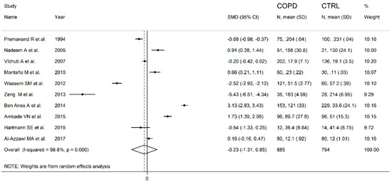 Forest plot of studies examining blood/erythrocytes GPx values of COPD and non-COPD.