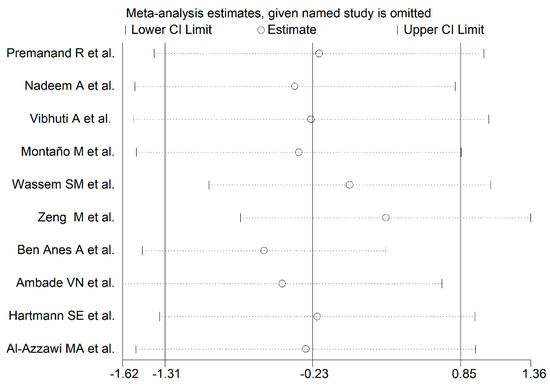 The forest plot for the serum/plasma GPx concentrations in COPD patients and non-COPD subjects is described in Figure 7. In five studies [40,41,43,44,47], COPD patients had lower serum GPx concentrations when compared to non-COPD subjects (mean difference range, −5.43 to −0.20), and this difference was statistically significant in three studies [40,43,44]. In the remaining five studies [26,42,45,46,48], COPD patients had higher serum GPx concentrations (mean difference range, 0.16 to 3.13), and this difference was statistically significant in four studies [26,42,45,46]. Extreme heterogeneity between studies was observed (I2 = 98.8%, p < 0.001). Thus, random-effects models were used. Overall, the pooled results showed that the serum/plasma GPx concentrations were not significantly different between the two groups (SMD= −0.23, 95% CI −1.31 to 0.85, p = 0.67). The effect size was not substantially altered (range between −0.59 and 0.30, Figure 8) after sequentially removing individual studies.