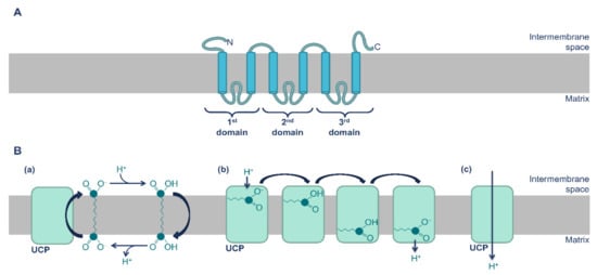 UCPs are integral transmembrane proteins of the inner mitochondrial membrane and members of the mitochondrial anionic transporter family SLC25 [,,,]. UCPs are constituted by three repetition domains, each composed of two α-helix regions [,,,,]. The carboxy and amino-terminal regions are on the intermembrane space while the α-helix regions are linked by long loops that reside on the matrix side of mitochondria (Figure 2A) [,,]. There are two main hypotheses concerning the proton transport mechanism by UCPs: the flip-flop model and the cofactor model (Figure 2B) [,]. The flip-flop model occurs in the presence of high concentrations of fatty acids, in which the protonated form of the fatty acid freely crosses the membrane towards the matrix and dissociates the proton in the matrix due to the pH difference (higher in the matrix). The anionic fatty acid returns to the intermembrane space with the help of the UCP, completing the cycle. In the cofactor model, protons can be transported independently or, at a higher rate, linked to the carboxyl group of fatty acids, which operate as prosthetic groups.