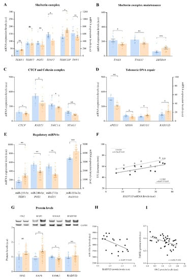 Dot plot graph of mRNA, miRNA and protein expression levels of main molecules associated with telomere homeostasis. (A) Genes of shelterin complex. (B) Genes involved in the maintenance shelterin complex. (C) CTCF and cohesin complex genes. (D) Genes involved in the telomere DNA repair. (E) miRNAs targeting TERF1, POT1, RAD21 and RAD51D. (F) Correlation of RAD51D mRNA levels with left ventricular end-systolic (LVESD) and left ventricular end-diastolic (LVEDD) diameters. (G) TIN2, RAP1, TANK1 and RAD51D protein levels. (H) Correlation of RAD51D protein levels with miR-103a-3p expression levels. (I) Correlation of TIN2 with TANK1 protein levels. The results were obtained by mRNA-sequencing SOLiD 5500XL platform and ncRNA-sequencing Illumina HiSeq 2500 platform. Data are presented as the mean ± SEM. au, arbitrary units. Ischemic cardiomyopathy patients (orange), controls subjects (blue). Left ventricular end-systolic diameter (black), left ventricular end-systolic diameter (grey). * p < 0.05, ** p < 0.01, *** p < 0.0001.