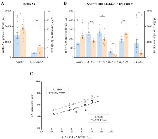 Dot plot graph of lncRNAs expression and mRNA expression levels of altered genes associated with TERRA and GUARDIN regulation. (A) TERRA and GUARDIN expression. (B) Genes involved in TERRA and GUARDIN regulation. (C) Correlation of ATF7 mRNA levels with left ventricular end-systolic (LVESD) and left ventricular end-diastolic (LVEDD) diameters. The results were obtained by mRNA-sequencing SOLiD 5500XL platform and ncRNA-sequencing Illumina HiSeq 2500 platform. Data are presented as the mean ± SEM. au, arbitrary units. Ischemic cardiomyopathy patients (orange), controls subjects (blue). Left ventricular end-systolic diameter (black), left ventricular end-systolic diameter (grey). * p < 0.05, ** p < 0.01.