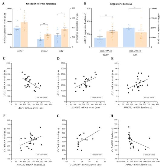 Dot plot graph of mRNA (n = 23) and miRNA (n = 30) expression levels of altered molecules associated with stress oxidative response. (A) mRNA relative expression levels of altered genes associated with stress oxidative response. (B) miRNAs target SOD1 and CAT. (C) Correlation of ATF7 mRNA levels with SOD1 mRNA levels. (D) Correlation of HMGB2 mRNA levels with SOD1 mRNA levels. (E) Correlation of HMGB2 mRNA levels with SOD3 mRNA levels. (F) Correlation of HMGB2 mRNA levels with CAT mRNA levels. (G) Correlation of GUARDIN mRNA levels with CAT mRNA levels. (H) Correlation of FOSL2 mRNA levels with CAT mRNA levels. The results were obtained by mRNA-sequencing SOLiD 5500XL platform and ncRNA-sequencing Illumina HiSeq 2500 platform. Data are presented as the mean ± SEM. au, arbitrary units. Ischemic cardiomyopathy patients (orange), controls subjects (blue). * p < 0.05, ** p < 0.01.