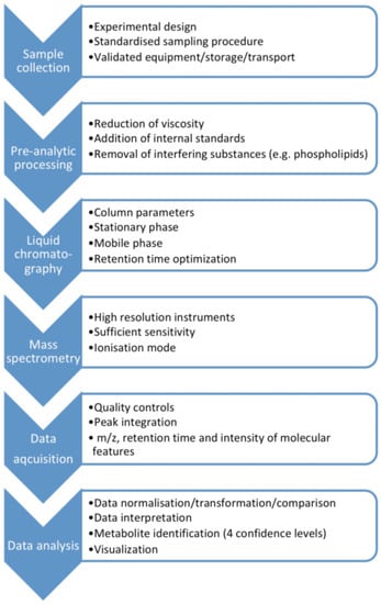 - Salvagno, G.L.; Danese, E.; Lippi, G. Preanalytical variables for liquid chromatography-mass spectrometry (LC-MS) analysis of human blood specimens. Clin. Biochem. 2017, 50, 582–586. [Google Scholar] [CrossRef]