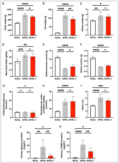 Characteristics of rats at 44 weeks of age: (A) whole-body weight; (B) fat weight; (C) kidney weight; (D) mean food intake; (E) gastrocnemius muscle weight; (F) soleus muscle weight; (G) fasting blood glucose; (H) blood glucose under ad libitum feeding; (I) HbA1c levels (WLRs: n = 8, WFRs: n = 8, WFRs-T: n = 7); (J) urinary albumin/creatinine (Cr) ratio; and (K) liver-type fatty-acid-binding protein (L-FABP)/Cr, at 44 weeks of age (n = 6, respectively). All data are means ± standard deviation (SD). * p < 0.05, ** p < 0.01, *** p < 0.001, **** p < 0.0001, ns: not significant. WLRs, sedentary Wistar lean rats; WFRs, sedentary Wistar fatty rats; WFRs-T, Wistar fatty rats with treadmill exercise training.