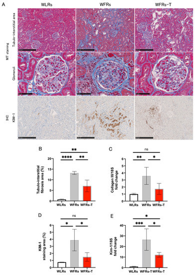 Changes in renal fibrosis and tubular cell damage: (A) representative images of MT (Masson’s trichrome) staining in the tubulointerstitial area (scale bar: 250 μm) and glomeruli (scale bar: 50 μm) as well as immunohistochemistry (IHC) of KIM-1 in the tubulointerstitial area (scale bar: 250 μm); (B) quantification of tubulointerstitial fibrosis area (n = 4); (C) mRNA expression of collagen III, normalized according to 18S levels in the renal cortex (n = 5); (D) quantification of KIM-1 staining area (n = 3); and (E) mRNA expression of Kim-1, normalized according to 18S levels in the cortex (n = 3–4). All data are means ± standard deviation (SD). * p < 0.05, ** p < 0.01, *** p < 0.001, **** p < 0.0001, ns: not significant. KIM-1 and Kim-1, kidney injury molecule-1; WLRs, sedentary Wistar lean rats; WFRs, sedentary Wistar fatty rats; WFRs-T: Wistar fatty rats with treadmill exercise training.