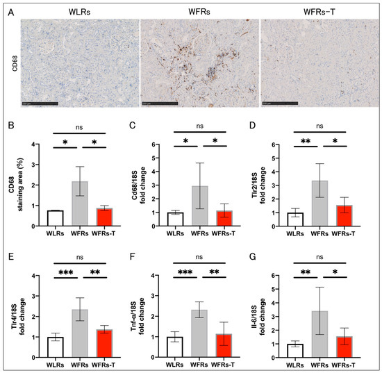 The intensity of CD68 immunohistochemical staining in tubulointerstitial areas (Figure 3A,B) and mRNA expression of inflammation-related genes, including Cd68, Tlr2, Tlr4, Tnf-α, and Il-6 (Figure 3C–G) were markedly higher in the WFRs group than the WLRs group; however, TET significantly ameliorated the renal inflammatory changes in the WFRs.