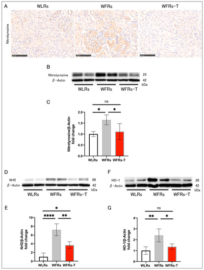 Changes in renal oxidative stress: (A) representative images of nitrotyrosine immunohistochemistry (scale bar: 250 μm); (B) representative immunoblots of nitrotyrosine and β-actin; (C) the quantitative ratios of nitrotyrosine to β-actin in the renal cortex (n = 4); (D) representative immunoblots of nuclear factor-erythroid 2-related factor 2 (Nrf2) and β-actin; (E) the quantitative ratios of Nrf2 to β-actin in the renal cortex (n = 4); (F) representative immunoblots of heme oxygenase 1 (HO-1) and β-actin; and (G) the quantitative ratios of HO-1 to β-actin in the renal cortex (n = 4). All data are means ± standard deviation (SD). * p < 0.05, ** p < 0.01, **** p < 0.0001, ns: not significant. WLRs, sedentary Wistar lean rats; WFRs, sedentary Wistar fatty rats; WFRs-T, Wistar fatty rats with treadmill exercise training.