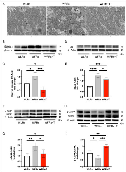 Changes in mitochondrial morphology, apoptosis, and autophagy in the kidney: (A) representative transmission electron microscopy images of proximal tubular cells (scale bar: 1 μm); (B) representative immunoblots of cleaved caspase 3 and β-actin; (C) quantitative ratios of cleaved caspase 3 to β-actin in the renal cortex (n = 4); (D) representative immunoblots of p62/SQSTM1 (p62) and β-actin; (E) quantitative ratios of p62 to β-actin in the renal cortex (n = 4); (F) representative immunoblots of p-S6RP, S6RP, and β-actin; (G) quantitative ratios of p-S6RP to S6RP in the renal cortex (n = 4); (H) representative immunoblots of p-AMPK, AMPK, and β-actin; and (I) quantitative ratios of p-AMPK to AMPK in the renal cortex (n = 4). All data are means ± standard deviation (SD). * p < 0.05, ** p < 0.01, *** p < 0.001, **** p < 0.0001, ns: not significant. p-S6RP, phispho-S6 ribosomal protein; S6RP, S6 ribosomal protein; p-AMPK, phospho-AMP-activated kinase; AMPK, AMP-activated kinase; WLRs, sedentary Wistar lean rats; WFRs, sedentary Wistar fatty rats; WFRs-T: Wistar fatty rats with treadmill exercise training.