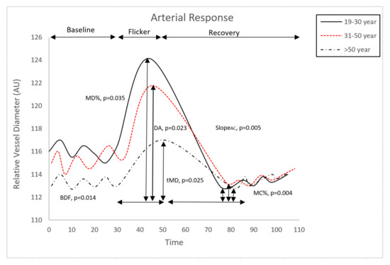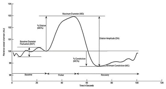 - Seshadri, S.; Ekart, A.; Gherghel, D. Ageing effect on flicker-induced diameter changes in retinal microvessels of healthy individuals. Acta Ophthalmol. 2016, 94, e35–e42. [Google Scholar] [CrossRef]