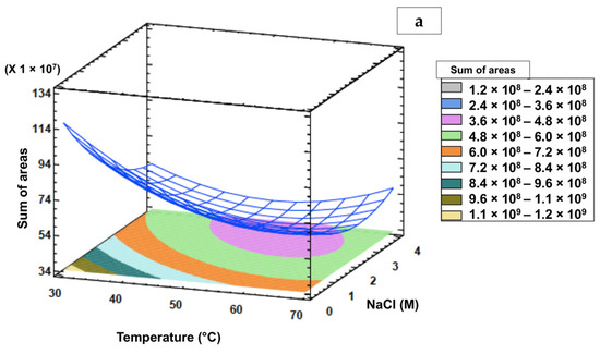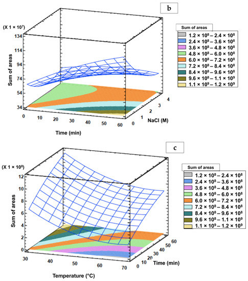 Response surface and contour plots showing interactions on the sum of areas values: (a): temperature vs. NaCl with fixed time at 60 min; (b) time vs. NaCl with the fixed temperature at 30 °C; (c) temperature vs. time with fixed NaCl at 0 M.