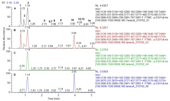 Separation was achieved on an UHPLC system Dionex Ultimate 3000RSLC (ThermoFisher Scientific, Inc., Waltham, MA, USA) with reversed phase column Kromasil Eternity XT C18 (1.8 µm, 2.1 × 100 mm) column maintained at 40 °C. The binary mobile phase consisted of A: 0.1% formic acid in water and B: 0.1% formic acid in acetonitrile. The run time was 33 min. The following gradient was utilized: the mobile phase was held at 5% B for 1 min, gradually turned to 30% B over 19 min, increased gradually to 50% B over 5 min, increased gradually to 70% B over 5 min, and finally increased gradually to 95% over 3 min. The system was then turned to the initial condition of 5% B and equilibrated over 4 min. The flow rate and the injection volume were set to 300 µL/min and 1 µL, respectively. The effluents were connected on-line with a Q Exactive Plus Orbitrap mass spectrometer where the compounds were detected [22].