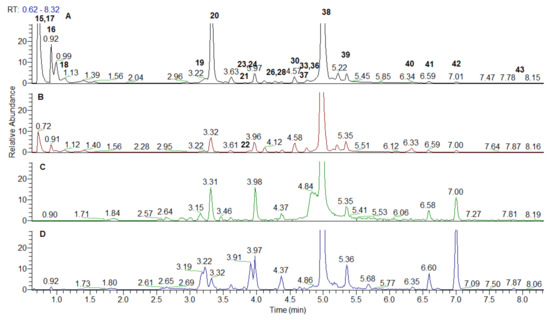 Extracted ion chromatogram of ellagitannins and ellagic acid derivatives from Spondias mombrin extracts: (A)—leaves water extracts; (B)—leaves methanol extract; (C)—stem bark water extract; (D)—stem bark methanol extract.