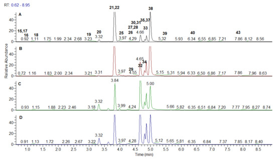 Extracted ion chromatogram of ellagitannins and ellagic acid derivatives from Spondias dulcis extracts: (A)—leaves water extracts; (B)—leaves methanol extract; (C)—stem bark water extract; (D)—stem bark methanol extract.