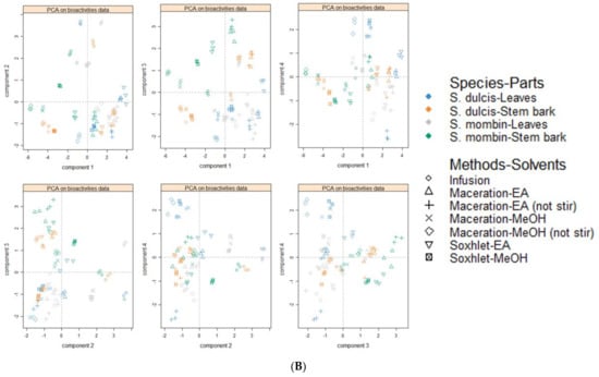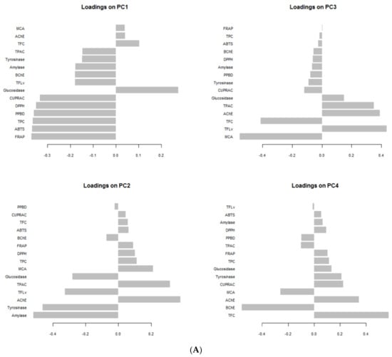 Principal component analysis (PCA) showing the variability of the total chemical composition, antioxidant and anti-enzymatic activity of Spondias species. (A) Loading plots displaying the relationship between the total chemical composition, antioxidant and anti-enzymatic activity and the four significant PCs. (B) Score plots showing the distribution of the samples in the six 2-dimension plans obtained from the four significant PCs.