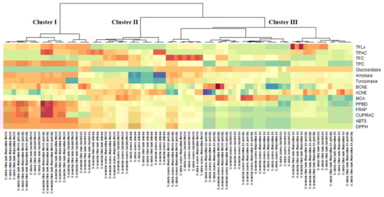 Furthermore, using the total chemical compounds and bioactivities datasets, principal component analysis was performed to uncover the variation among the extracts of Spondias species. Primarily, the small number of principal component apprehended most of the variation in the data were selected with reference to Kaiser rule [60]. Hence, four dimensions which possessed an eigenvalue higher than 1 and 80% of the variability were retained (Table S2). The bioactivities describing each principal component can be identify by referring to Figure 5A. The first component (PC1) predominantly represented the variation in antioxidant, TPC, and anti-glucosidase, the second component (PC2) largely depicted the variation in anti-amylase, anti-tyrosinase, anti-AChE, TFvL, and TPac, the third component (PC3) referred to variation in MCA, TFvl, and TFC while the fourth component (PC4) was mainly determined by TFC and anti-BChE. Regarding the distribution of the samples on the score plot (Figure 5B) deriving from the four principal components, there was some variability, however, it was not possible to identify clearly the different homogeneous groups. Therefore, a heat-map was created to classify the samples and also to identify the total bioactive compounds and biological activities characterizing each obtained clusters. As shown in Figure 6 three major clusters was obtained. Overall, the samples being in cluster I were found to have the highest biological activities, in particular the antioxidant properties, anti-tyrosinase, anti-amylase and anti-BChE activities. Well over the maximum amount of TPC and TFvl were achieved by the members of this clusters. Interestingly, this clusters were composed exclusively of the stem bark extracts of both species the majority of which were obtained using the methanol as solvent. This finding revealed that the stem bark of both species is more active than the leaves. It also suggested that the stem bark is richer in polar polyphenols. Sinan et al. [61] reported variation of antioxidant and enzyme inhibitory activities between the leaves and stem bark of U. togoensis and C. procera. Many authors argued that the concentration of molecules in plants tissues and/or parts vary considerably in terms of its ontogenetic development, the activity of some enzymes and under the impact of soil nutrient and environmental conditions [61,62]. Thereby, the biological activity of the extract of any plant being tightly bound to quantity of quality of molecules it contains, the ideal part should be chosen to derive the full potential of said plant. Furthermore, as evidenced that the stem bark of both species contained highest level of phenolic compounds and since the solubility of phenolic compounds depend on the present and position of –OH groups and the molecular size and the length of constituent hydrocarbon chains [63], it would be reasonable to use an intermediate polar solvent for the future investigations on these two species. The effectiveness of polar solvent like methanol is due to its intermediate polarity that allows it to easily dissolve low molecular weight having protonatable functional groups, i.e., OH [64]. However, considering the toxicity of methanol solvent for human, it would be preferred to evaluate other non-toxic solvent, i.e., ethanol, which possess polarity close to that of methanol.