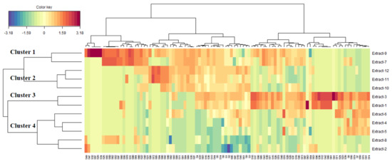 The consolidation of the 12 samples according to the amount of identified secondary metabolites was shown in Figure 7. As can be seen, the samples can be separated in four main cluster. Samples included in the cluster I (Spondias mombin leaves-infusion and S. mombin-leaves-MAC (no stir)) were richer in many compounds following by that of the cluster 3 (1-Spondias dulcis-leaves-Infusion and 3-S. dulcis-leaves-MAC (no stir)-MEOH) and cluster 2 (S. mombin-stem bark-Infusion; S. mombin-stem bark-MAC (no stir)-EA, and S. mombin-stem bark-MAC (no stir)-MEOH). The samples constituting the cluster 4 were lower in the majority of identified compounds. Moreover, some extracts were, individually, remarkably rich in many compounds. Illustratively, Spondias mombin leaves-infusion was rich in galloyl-geraniin (S29), ellagic acid- pentoside isomer (S32), ellagic acid-pentoside (S34), caffeic acid O-hexoside (S47), and kaempferol-3-O-dihexoside (S57). Similarly, ellagic acid deoxyhexoside (S33) was abundant in Spondias dulcis-leaves-Infusion while 3-S. cythera-leaves-MAC (no stir)-MEOH was rich in di HHDP-hexoside (S36), myricetin 7-O-deoxyhexoside (S71), and naringenin 8-C-hexoside (S91).