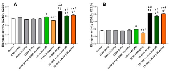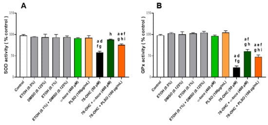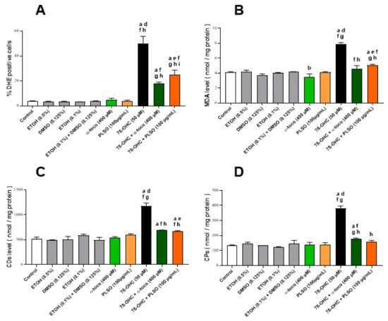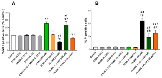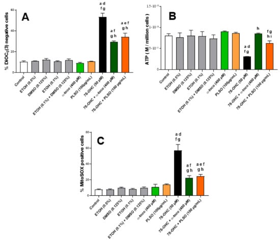 Murine C2C12 myoblasts were grown in Dulbecco’s modified Eagle’s medium (DMEM) supplemented with 10% (v/v) of heat-inactivated fetal bovine serum (FBS) and 1% (v/v) of penicillin (100 U/mL)/streptomycin (100 mg/mL). The cells were maintained in a humidified atmosphere (5% CO2, 95% air) at 37 °C. For subcultures, cells were trypsinized (0.05% trypsin − 0.02% EDTA solution) and passed twice a week. 7β-OHC was either from Sigma-Aldrich or provided by Mohammad Samadi (University of Lorraine, Metz, France); the purity was higher than 98%. The stock solutions of 7β-OHC was prepared at 800 µg/mL (2 mM), as previously described by Ragot et al. [67], and stored in the dark at 4 °C. A stock solution of PLSO was prepared at 80 mg/mL in dimethyl sulfoxide (DMSO; Sigma-Aldrich) and stored in the dark at 4 °C. An α-tocopherol (the major component of vitamin E; Sigma-Aldrich) solution was prepared to 80 mM in absolute ethanol, as previously described [60], and stored in the dark at 4 °C. For the different experiments, C2C12 myoblasts were used at 80% confluency; they were seeded either into Petri dishes of 10 cm in diameter (1.2 × 106 cells per Petri dish), in six-well plates (2 × 105 cells per well), or in 96-well plates (10 × 104 cells per well). After 12 h, the growth medium was removed and the C2C12 cells were incubated with 7β-OHC (20 µg/mL/50 µM) for 24 h with or without PLSO (100 µg/mL), or α-tocopherol (400 µM) (used as a positive control for cytoprotection) [28]. PLSO and α-tocopherol were introduced in the culture medium 2 h before 7β-OHC. The choice of the concentration of 7β-OHC (20 µg/mL/50 µM) and PLSO (100 µg/mL) was based on the dose-effect of 7β-OHC (5–80 µg/mL/12.5–200 µM) and PLSO (5–3200 µg/mL), which was realized with an MTT assay.