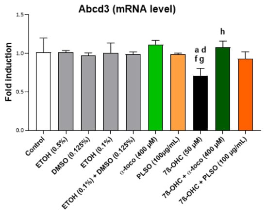 Thermal cycling conditions were as follows: activation of DNA polymerase (95 °C, 10 min), followed by 40 cycles of amplification at 95 °C for 15 s, 60 °C for 30 s, and 72 °C for 30 s, followed by a melting curve analysis to control for the absence of non-specific products. Gene expression was quantified using cycle to threshold (Ct) values and normalized by the 36B4 reference gene (Forward: 5′-gcgacctggaagtccaacta-3′; Reverse: 5′-atctgcttggagcccacat-3′). Abcd3 level was determined as fold induction of the control.