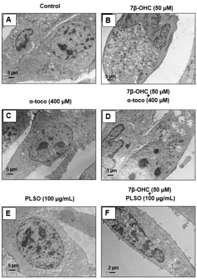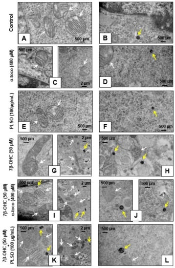 At the ultrastructural level, transmission electron microscopy (TEM) is the most powerful tools to observe morphological changes caused by various physical or chemical agents [84]. TEM was used to visualize mitochondrial and peroxisomal changes [80] in C2C12 cells cultured for 24 h in the presence or absence of 7β-OHC (50 µM) without or with PLSO (100 µg/mL) or α-tocopherol (400 µM) [85]. The samples were fixed for 1 h at 4 °C in 2.5% (w/v) glutaraldehyde diluted in a cacodylate buffer (0.1 M, pH 7.4), washed twice in cacodylate buffer, incubated in the dark for 1 h at 21 °C in Tris–HCl (0.05 M, pH 9.0) containing diaminobenzidine (DAB: 2.5 mg/mL) and H2O2 (10 µL/mL of a 3% solution); washed in cacodylate buffer (0.1 M, pH 7.4) for 5 min at 21 °C; post-fixed in 1% (w/v) osmium tetroxide diluted in cacodylate sodium (0.1 M, pH 7.4) for 1 h at 21 °C in the dark; and rinsed in cacodylate buffer (0.1 M, pH 7.4). The preparations were dehydrated in graded ethanol solutions and then embedded in Epon. Ultrathin sections were cut with an ultramicrotome, contrasted with uranyl acetate and lead citrate, and examined using an HT7800 electron microscope (Hitachi, Tokyo, Japan) operating at 100 kV and equipped with two advanced microscopy technique (AMT) cameras (Woburn, MA, USA).