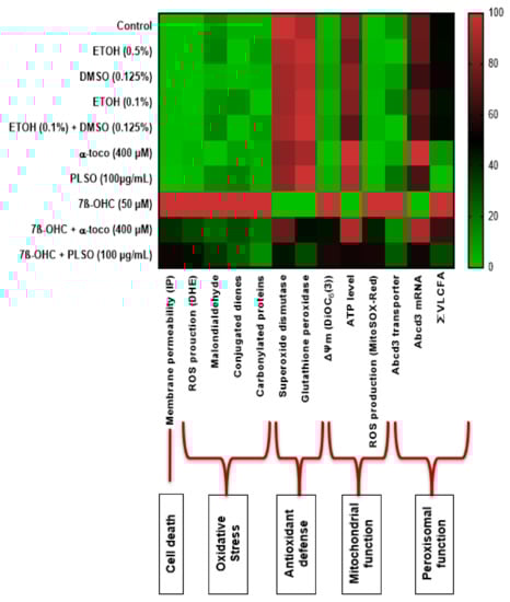 - Nury, T.; Sghaier, R.; Zarrouk, A.; Ménétrier, F.; Uzun, T.; Leoni, V.; Caccia, C.; Meddeb, W.; Namsi, A.; Sassi, K.; et al. Induction of peroxisomal changes in oligodendrocytes treated with 7-ketocholesterol: Attenuation by α-tocopherol. Biochimie 2018, 153, 181–202. [Google Scholar] [CrossRef]