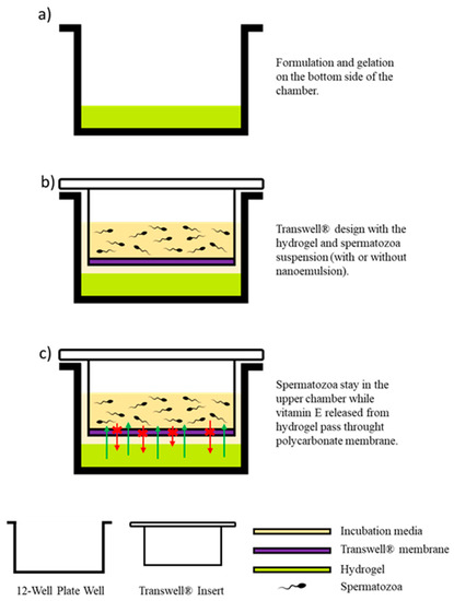 A new incubation method that utilizes a transwell chamber was developed for the incubation of sperm cells in the presence of hydrogels (see Figure 1). The need to develop this system arose from the requirement of preventing sperm from becoming embedded within the hydrogel structure. The system designed to generate vitamin E-loaded hydrogels (HVEs) was the following: Hydrogels were obtained using slow pH change generated by the well-controlled hydrolysis of glucono-δ-lactone (GDL). Then, 10 mg of HG hydrogelator were dissolved in 1 mL of 70 mM aqueous NaOH and 0.25 mg of vitamin E (Trolox) were added to the solution to attain 1 mM of free vitamin E analogue (Trolox). Next, the solution was slowly acidified by adding 2 mg of GDL [30]. The resulting solutions were poured into the bottom of the chamber and were stored for 24 h to allow complete gelation. Hydrogels were maintained at 4 °C until use. Finally, a spermatozoa suspension (with or without nanoemulsions) was placed in the upper chamber (12 mm diameter insert), over a 0.4 µm pore-size polycarbonate membrane. The entire system was embedded using BGM.