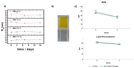 The NVEs were characterized by DLS, and had an average particle size of 156 ± 1.3 nm for formulations and a very low polydispersity index (PDI) ranging from 0.117 to 0.145. The NVEs were negatively charged with a value of −18.2 ± 4.4 mV, and had high physical colloidal stability. The values of hydrodynamic radio (RH) and PDI of the NVEs were monitored using DLS in a 7 day experiment. The negligible increase in each parameter denoted the high stability of the formulations (Figure 2a). Furthermore, the formulation of the hydrogel systems was confirmed by the observation of no gravitational flow when employing the test tube inversion method (Figure 2b). The hydrogel had no antioxidant activity. Neither free radical production nor lipid peroxidation were different from the control (Figure 2c).