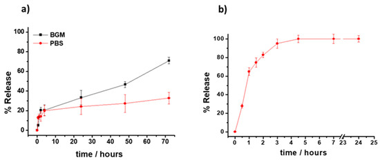 In vitro release profiles: (a) NVEs in PBS and BGM at 37 °C; (b) HVEs in PBS at 37 °C.