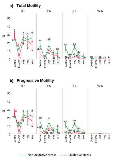 After supplementation with free VE, NVEs, HVEs, and the combination of HVEs and NVEs (H + N), total motility down to 24 h incubations in which all the samples were practically motionless (control; 0 h, 26.9 ± 3.3; 2 h, 17.5 ± 2.7; 5 h, 12.9 ± 2.2; and 24 h, 0.69 ± 0.7) p < 0.05) (Figure 4a). Whereas, without exogenous oxidative treatment, free VE treatment rendered the sperm practically motionless after 2 h (0.07 ± 1.5). In this sense, NVE preserved motility at similar values to the control (control 2 h, 17.5 ± 2.7; and NVEs 2 h, 16.8 ± 4.4), while HVEs (5.6 ± 5.6) and H + N (6.9 ± 2.7) had lower values as compared with the control but higher as compared with free vitamin E. Similar results were obtained after 5 h incubation at 37 °C.