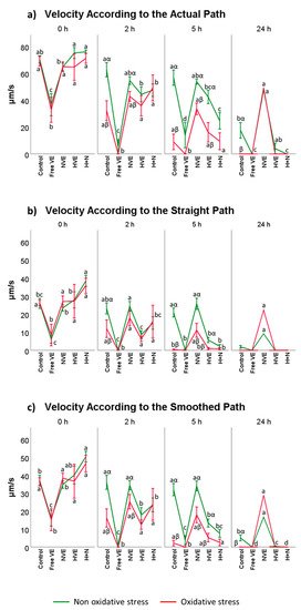 Velocity according to the actual path (VCL), velocity according to the straight path (VSL) and velocity according to the smoothed path (VAP) (Figure 5a–c) were preserved at similar values to the control, regardless of supplementation after 2 h and 5 h incubation times following the pattern: control ≈ NVEs > H + N > HVEs. However, when applying the exogenous oxidation source, the velocity parameters improved as regards the control after 2 and 5 h of incubation following the pattern: control > NVEs > H + N > HVEs, and all treatments differed significantly regarding free vitamin E (p < 0.01); only NVEs maintained velocity after 24 h of incubation.