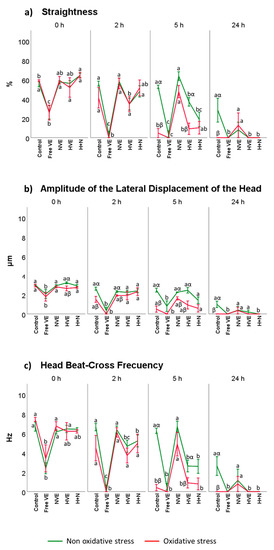 With regard to the amplitude of the lateral displacement of the sperm head (ALH) (Figure 6b), there were no significant differences among the control, NVEs, HVEs, and H + N at either 0, 2, and 5 h of incubation or with or without an exogenous source of oxidation. Finally, regarding sperm beat frequency (BCF) (Figure 6c) and after 2 and 5 h of incubation, significant differences were observed between the control vs. HVEs, and H + N (p < 0.01), and free vitamin E vs. all treatments (p < 0.02). No significant differences were found after 24 h of incubation. When applying an oxidizing agent, BCF and NVEs had the highest values, with significant differences to the other treatments at 5 and 24 h (p < 0.01).