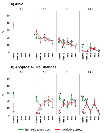 Vitamin E formulation effects on sperm viability. Plots (a,b) represent the triple interaction of different vitamin E treatments × oxidative treatment × incubation time for the flow cytometry analysis of sperm viability. The various lowercase Latin letters (p < 0.05) indicate significant differences between vitamin E treatments, while the different Greek letters (p < 0.05) compare each treatment at the same time with a different oxidative stress status.