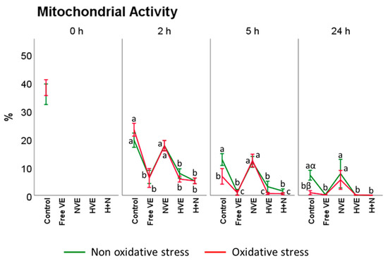 The NVE supplementation maintained the mitochondrial activity at every incubation time at similar values to the control, while the other treatments proportionally decreased following the pattern: NVEs ≈ control > HVEs > free vitamin E > H + N, with significant differences among the NVE and HVE, free vitamin E, and H + N treatments (p < 0.01). When an exogenous oxidative source was applied, the NVE treatment had greater mitochondrial activity than the control following the pattern: NVEs > control > free vitamin E > HVEs > H + N, where the NVE treatment and the control had significantly greater mitochondrial activity than the other treatments (p < 0.01) (Figure 8).