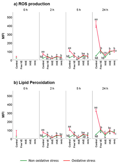 These ROS measurements were reflected in a similar profile for lipid peroxidation (LPO) (Figure 9b). As described above, values increased at every incubation time in the medium, with the NVEs being the best antioxidant treatment, following the same pattern: free vitamin E > HVEs > H + N > control > NVEs, and with significant differences between NVEs and the other treatments (p < 0.001). With the oxidative treatment, all the VE formulations also showed their high efficacy as regards preventing lipid peroxidation, following the pattern: control > free vitamin E > HVEs > H + N > NVEs, with significant differences between these treatments and the control at any incubation time (p < 0.001).