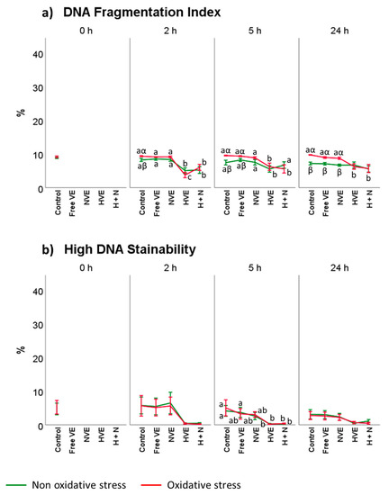 Vitamin E formulation effects on DNA. Plots (a,b) represent the triple interaction of different vitamin E treatments × oxidative treatment × incubation time for the flow cytometry analysis of DNA fragmentation index and high DNA stainability (median fluorescence of sperm assessed by SCSA®). The various lowercase Latin letters (p < 0.05) indicate significant differences between vitamin E treatments, while the different Greek letters (p < 0.05) compare each treatment at the same time with a different oxidative stress status.