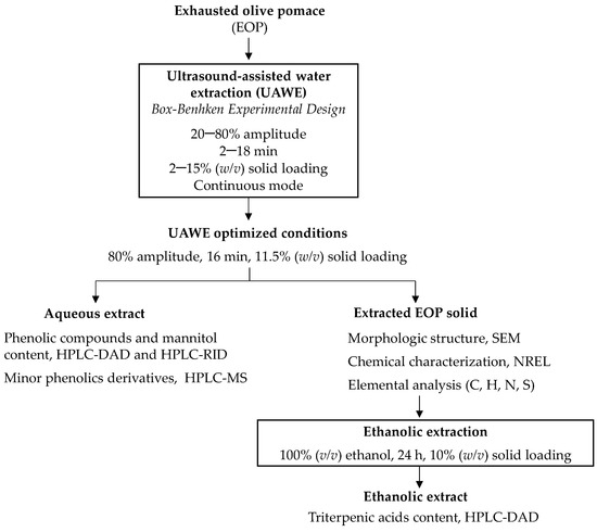Figure 1 shows the experimental procedure followed in this work in order to extract phenolic compounds and mannitol from EOP by UAWE and to optimise the experimental conditions. After that, triterpenic acids were recovered in a second ethanolic extraction and the resulting fractions were characterized.