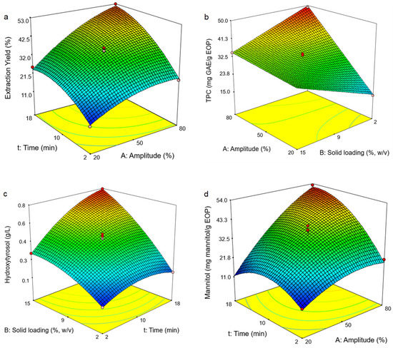 Response surfaces obtained by the Box–Behnken design for exhausted olive pomace: (a) extraction yield, (b) total phenolic content (TPC), (c) hydroxytyrosol concentration and (d) mannitol content. The solid loading was fixed at 8.5% (w/v) in plot (a,d), the extraction time at 10 min in plot (b) and the amplitude at 50% in plot (c).