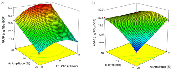 Two common assays were performed to evaluate the impact of the UAWE on the antioxidant capacity of the EOP extracts. The software generated different model equations for the FRAP and ABTS assays, i.e., Equations (9) and (10), respectively (Table 3). For both responses, the linear terms of the amplitude and extraction time have a positive influence, while solid loading has a negative influence. As examples, Figure 3a shows the response surface for amplitude and solid loading at 10 min and Figure 3b represents the amplitude and extraction time at a fixed solid loading of 8.5%.