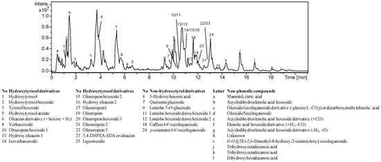 Base peak chromatogram and compounds characterized in the aqueous extracts obtained from pelletized exhausted olive pomace after ultrasound-assisted water extraction at 80% amplitude, 16 min and 11.5% solid loading (w/v).