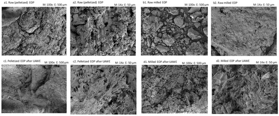 The cellular structure of the raw (pelletized) and milled EOP before and after UAWE was investigated by SEM. The panoramic images (at 100× magnification, 500 μm scale) of the raw pelletized and milled EOP showed a predominance of plant material (Figure 5(a1,b1), respectively). Not surprisingly, the milled EOP presented a more disaggregated structure due to the milling conditioning step.