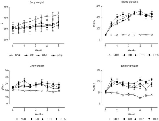 Time-course curves of the evolution of body weight, blood glucose, mean daily chow ingestion, and drinking water (mean ± standard error of the mean) in control nondiabetic rats (NDR), control diabetic rats (DR), and DR treated with hydroxytyrosol 1 mg/kg/day p.o. (HT-1) or 5 mg/kg/day p.o. (HT-5). N = 10 rats per group.