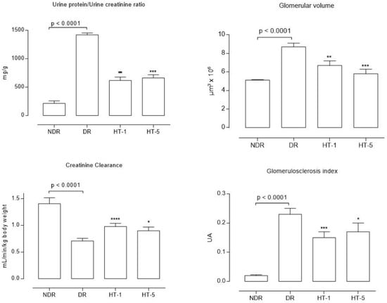 Mean values (mean ± standard error of the mean) of the proteinuria/urine creatinine ratio, calculated creatinine clearance, glomerular volume, and glomerulosclerosis index after eight weeks of follow up in control nondiabetic rats (NDR), control diabetic rats (DR), and DR treated with hydroxytyrosol 1 mg/kg/day p.o. (HT-1) or 5 mg/kg/day p.o. (HT-5). N = 10 rats per group. * p = 0.04, ** p = 0.001, *** p = 0.004, **** p < 0.0001, with respect to DR.