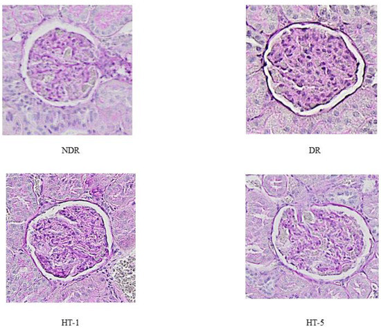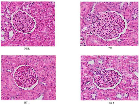 Representative examples of glomerular images from control nondiabetic rats (NDR), control diabetic rats (DR), and DR treated with hydroxytyrosol 1 mg/kg/day p.o. (HT-1) or 5 mg/kg/day p.o. (HT-5). Hematoxylin–eosin (×10).