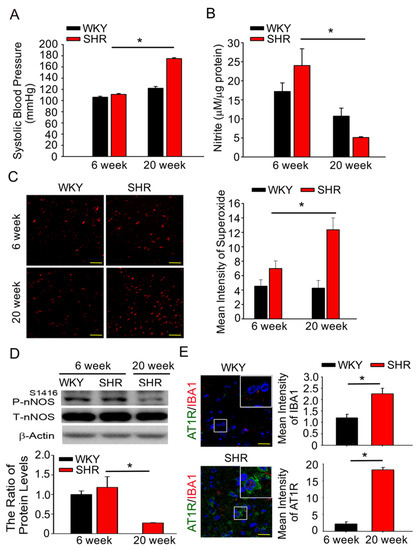 Ang II supports superoxide generation, increases the activation of microglia and restores the nNOS pathway in the NTS of spontaneously hypertensive rats. (A,B) Graph showing systemic blood pressure (SBP) and nitric oxide (NO) concentrations in the nucleus tractus solitarius (NTS) of normotensive Wistar Kyoto rats (WKY; 6-, 20-week-old) and spontaneously hypertensive rats (SHRs; 6-, 20-week-old). The bar graph shows the NO concentration as μM nitrate per μg of total protein. (C) Representative images of DHE-treated brain sections, images photographed at ×280 magnification. ROS index in the NTS of the SHRs groups (20 weeks old) was compared to SHRs (6 weeks old). The ROS index is the relative mean fluorescence intensity for dihydroethidium. Sections including the NTS of SHRs rats displayed significant increase in DHE fluorescence compared with the SHRs (6 weeks old) group sections. (D) Quantitative immunoblotting analysis of nNOSS1416 phosphorylation in the NTS of 6-week-old WKY, SHRs and 20-week-old SHRs. One-way analysis of variance (ANOVA) with Scheffé post-hoc was performed for statistical analysis in Figure 1A–D. (E) Representative images for immunofluorescence staining of AT1R-positive cells (green) and microglial marker IBA-1 (red) in NTS sections of WKY and SHRs, counterstained with 4′,6-diamidino-2-phenylindole (DAPI for blue color). The images were photographed at ×400 and 1000 magnification. The Mann–Whitney U-test was performed for statistical analysis in Figure 1E. The values are presented as mean ± SEM. * p < 0.05 indicates significant difference from 6-week-old SHRs (n = 6~8 per group).