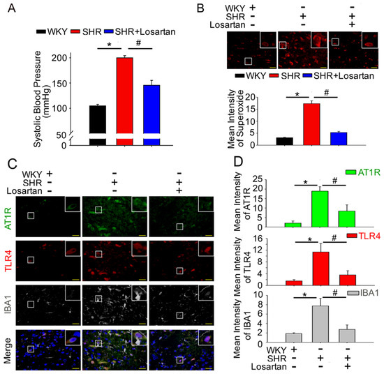The downregulation of AT1R-induced superoxide generation is associated with the activation of microglia and the expression of TLR4 in the NTS of spontaneously hypertensive rats. (A) SBP after losartan administration for 2 weeks. (B) Representative images of DHE-treated brain sections, photographed at ×280 magnification. Bar graph representation of ROS index in the NTS of WKY, SHRs, and SHRs treated with losartan. (C,D) Representative fluorescence images for AT1R (green), TLR4 (red) and microglial marker IBA-1 (white)-positive cells in the NTS sections of WKY, SHRs, and SHRs treated with losartan. The images were photographed at ×400 and 1000 magnification. The Mann–Whitney U-test was performed for statistical analysis in Figure 1E. One-way analysis of variance (ANOVA) with Scheffé post-hoc was performed for statistical analysis. The values are presented as mean ± SEM. * p < 0.05 indicates significant difference from 20-week-old WKY. # p < 0.05 versus SHR. All data are presented as means ± SEM (n = 6 per group).